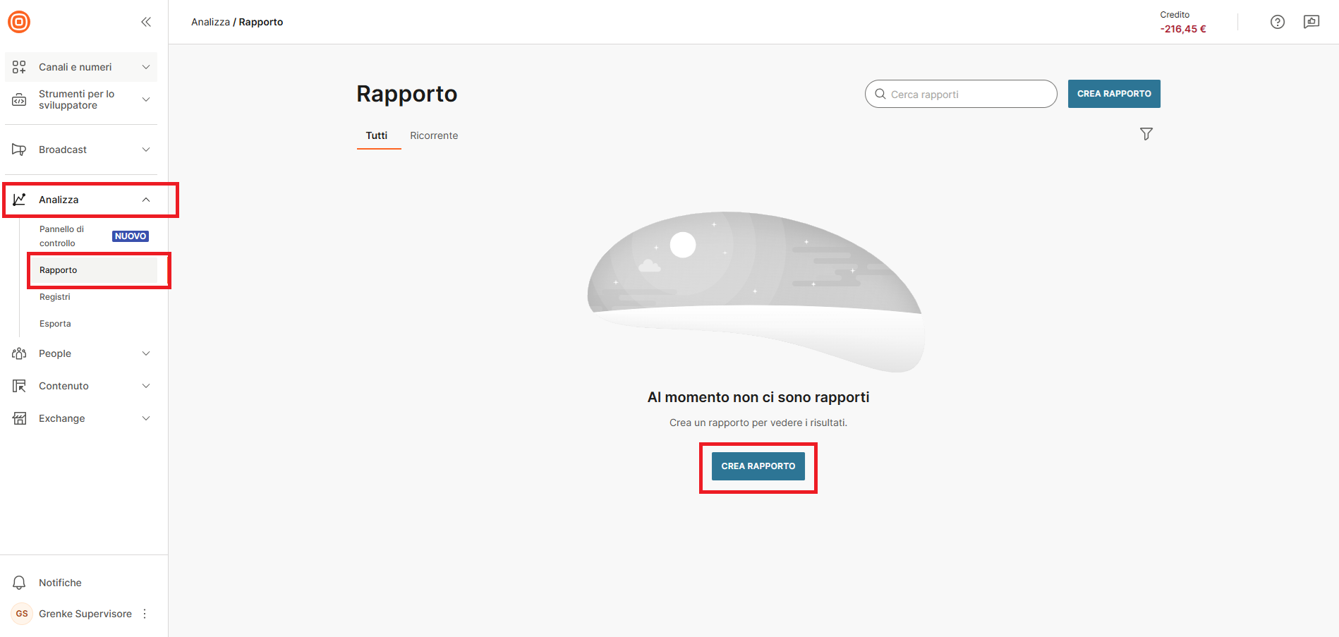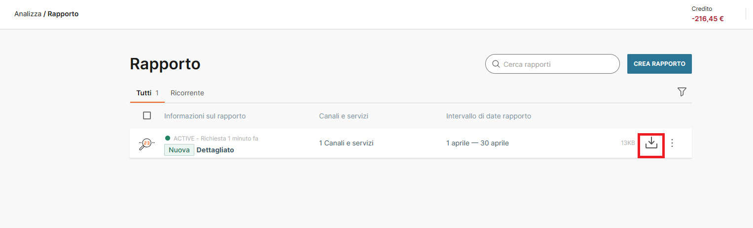2. Create a downloadable report by clicking on Analizza → Rapporto → Crea Rapporto