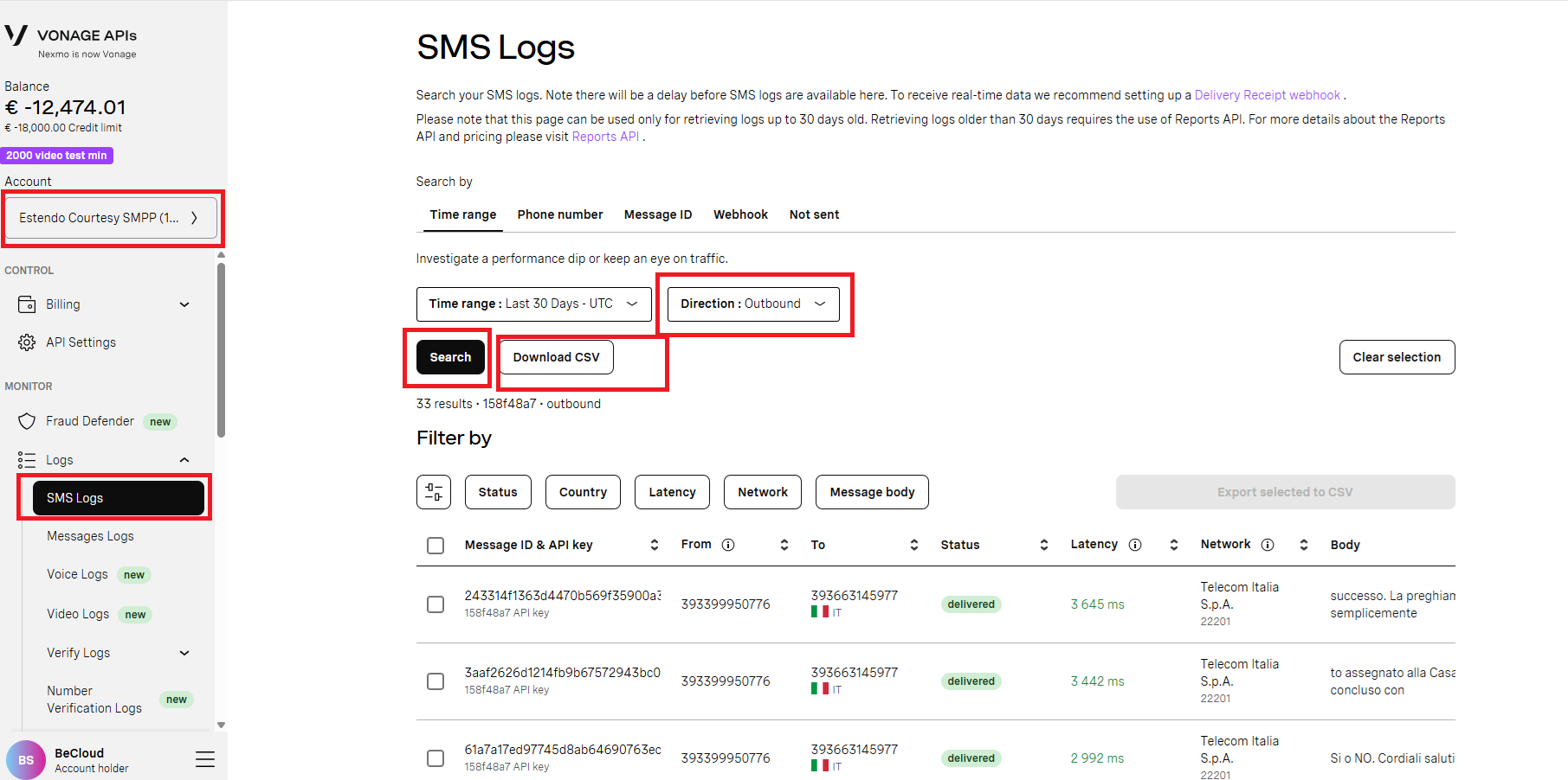 2. On the left, under the section Account, select the Api Key. Once selected, create a downloadable report by selecting SMS Logs → Direction → Search → Download CSV. Make sure if the customer handles both Inbound and Outbound, make this step for both the directions